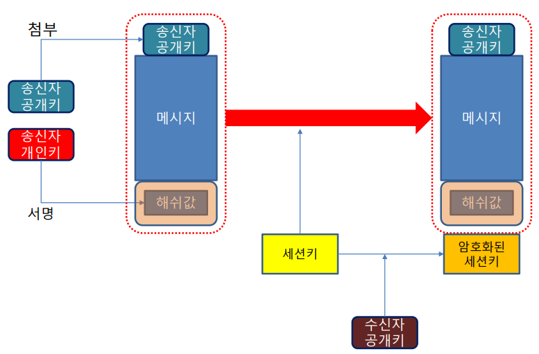 -특징 : 기밀성, 무결성, 송신자에 대한 인증 및 부인 봉쇄까지 모두 가능하다.