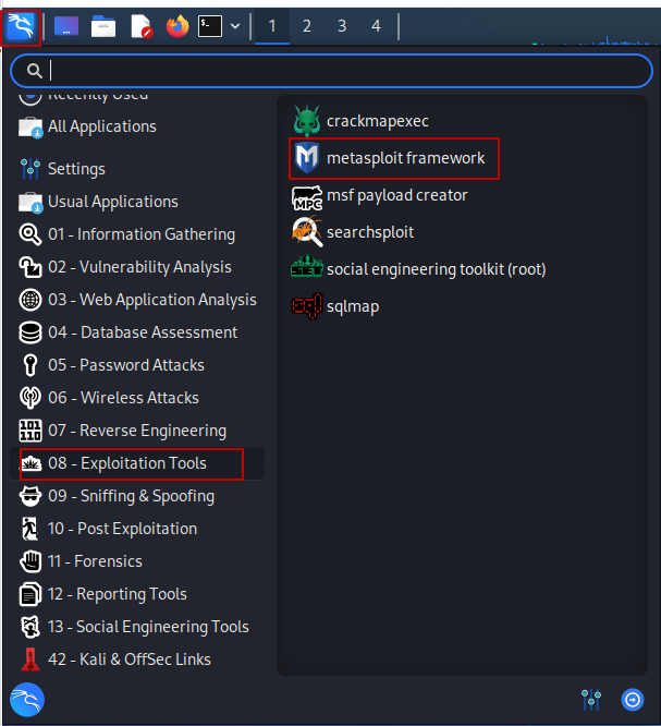 Exploitation Tools에 있는 metasploit framework 툴을 사용할 것이다.