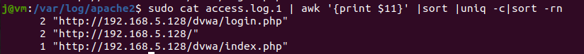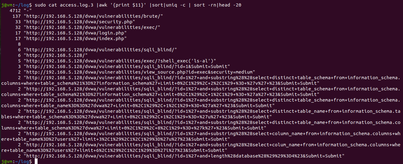 sudo cat access.log.3 | awk '{print $11}' | sort | uniq -c | sort -rn | head -20 헤드를 사용해 많이 사용한 20개만 출력을 한다.