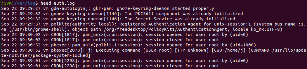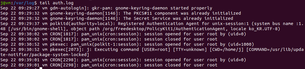 tail auth.log // 맨 아래에서부터 10줄 보임 --> New log