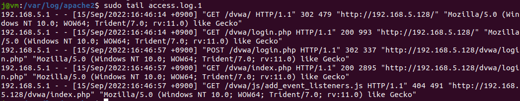 $11가 의미하는 건 192.168.5.1 - - [15/Sep/2022:16:46:05 +0900] "GET /dvwa/dvwa/css/login.css HTTP/1.1" 200 741 "http://192.168.5.128/dvwa/login.php" "Mozilla/5.0 (Windows NT 10.0; WOW64; Trident/7.0; rv:11.0) like Gecko"에서 구분자(공백) 기준으로 11번째에 있기 때문에 $11을 사용한다.