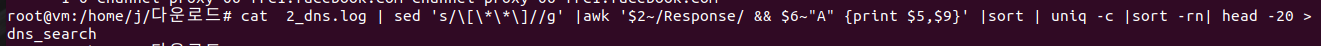 cat 2_dns.log | sed 's/\[\*\*\]//g' |awk '$2~/Response/ && $6~"A" {print $5,$9}' |sort | uniq -c |sort -rn| head -20 > dns_search 명령어는 Response로 시작하는 것 중에 $5와 $9를 출력한다.