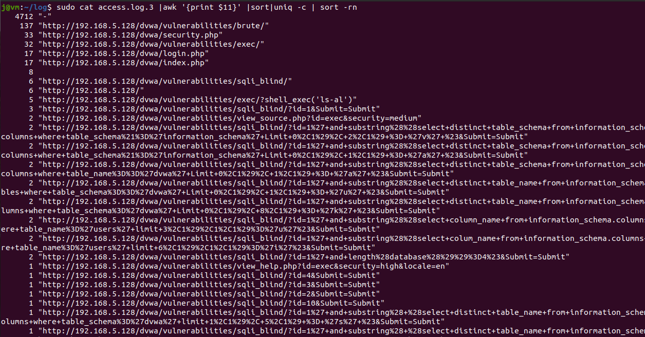 sudo cat access.log.3 | awk '{print $11}' | sort | uniq -c | sort -rn으로 보면 너무 많은 로그가 출력이 된다.