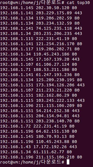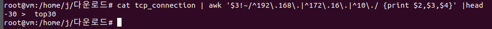cat tcp_connection | awk '$3!~/^192\.168\.|^172\.16\.|^10\./ {print $2,$3,$4}' | head -30 > top 30이다.
