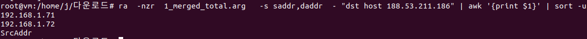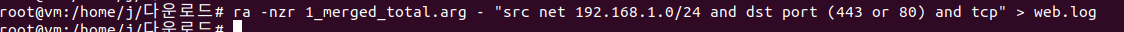 ra -nzr 1_merged_total.arg -s saddr, daddr, dport - "src net 192.168.1.0/24 and dst port (443 or 80) and tcp" | sort | uniq -c | sort -rn > web.log으로도 사용이 가능하다.