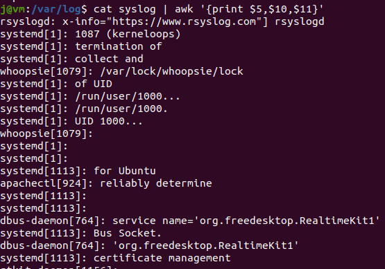 cat syslog | awk '{print $5,$10,$11}'에서 awk를 사용을 하면 원하는 것만 골라서 볼 수 있다.