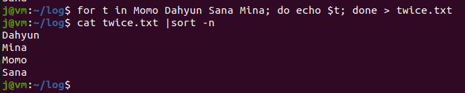 $ cat twice.txt | sort | sort -rn // rn 은 내림차순