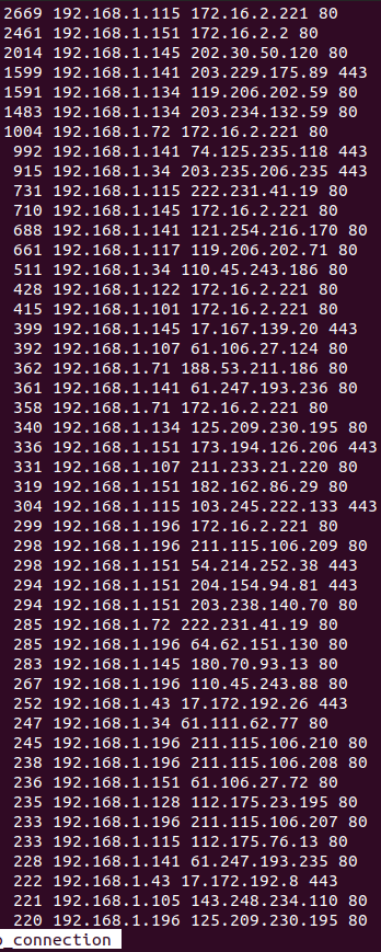 ra -nzr 1_merged_total.arg -s saddr, daddr, stime, dport - "tcp" | awk '{print $1,$2,$4}' | sort | uniq -c | sort -rn > tcp_connection에서 stime을 넣었다 제거하는 이유는 daddr과 dport가 합쳐져서 172.16.2.211.80으로 되기 때문이다.