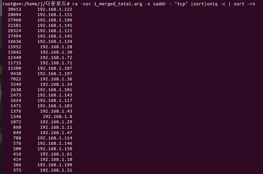 ra -nzr 1_merged_total.arg -s saddr - "tcp" | sort | uniq -c | sort –rn