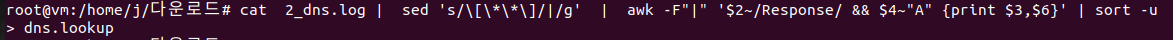 dns.log에서 sed로 [**] 구분자를 없애고 Response, A를 포함하고 있는 도매임 네임과 IP주소를 dns.lookup파일로 만들어준다.