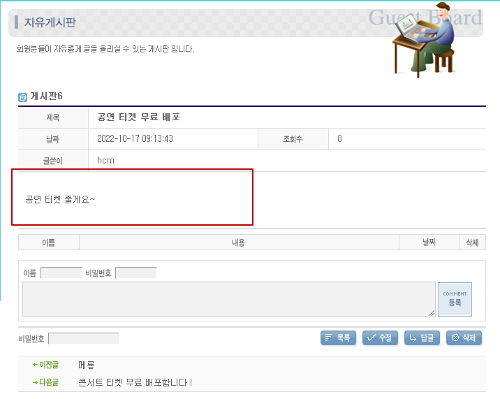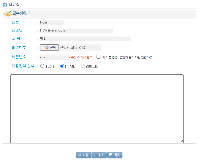 글쓰기 ⇒ 글 수정 ⇒ 패스워드 입력 ⇒ 상세 페이지 ⇒ 패스워드 입력 ⇒ 수정 페이지 접근 ⇒ 패스워드 입력(패스워드가 입력이 되어 있음) ⇒ 수정 완료