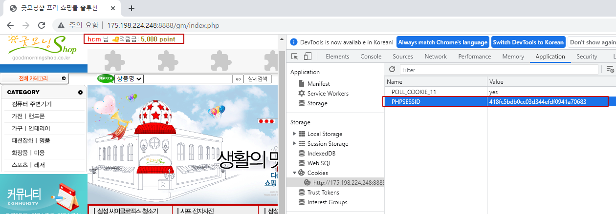 개발자 모드에서 Application로 이동을 하면 쿠키값을 볼수 있다.