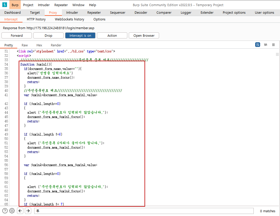 Response에서 주민등록에 대한 소스 코드를 볼 수 있다.