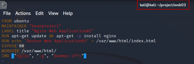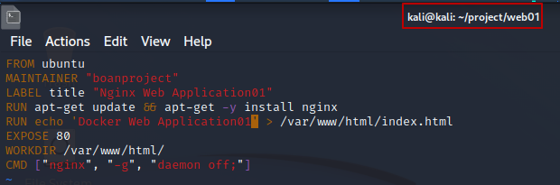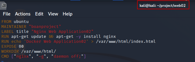 Dockerfile의 내용 부분 중 RUN echo 'Docker Web Application' > /var/www/html/index.html 이 실행이 되는지 확인